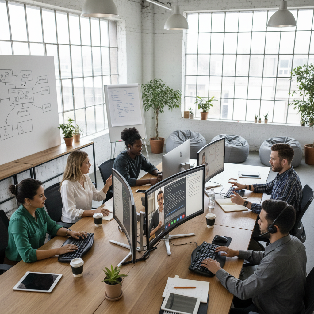 Nowoczesne biuro z zespołem uczestniczącym w webinarze, ekrany komputerów z transkrypcją webinaru, szybka praca i komunikacja – zastosowanie narzędzi do transkrypcji AI.