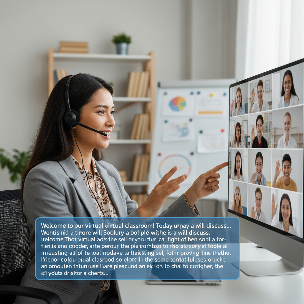 Nauczycielka prowadząca lekcję online z napisem automatycznej transkrypcji na ekranie – nowy standard w edukacji cyfrowej.