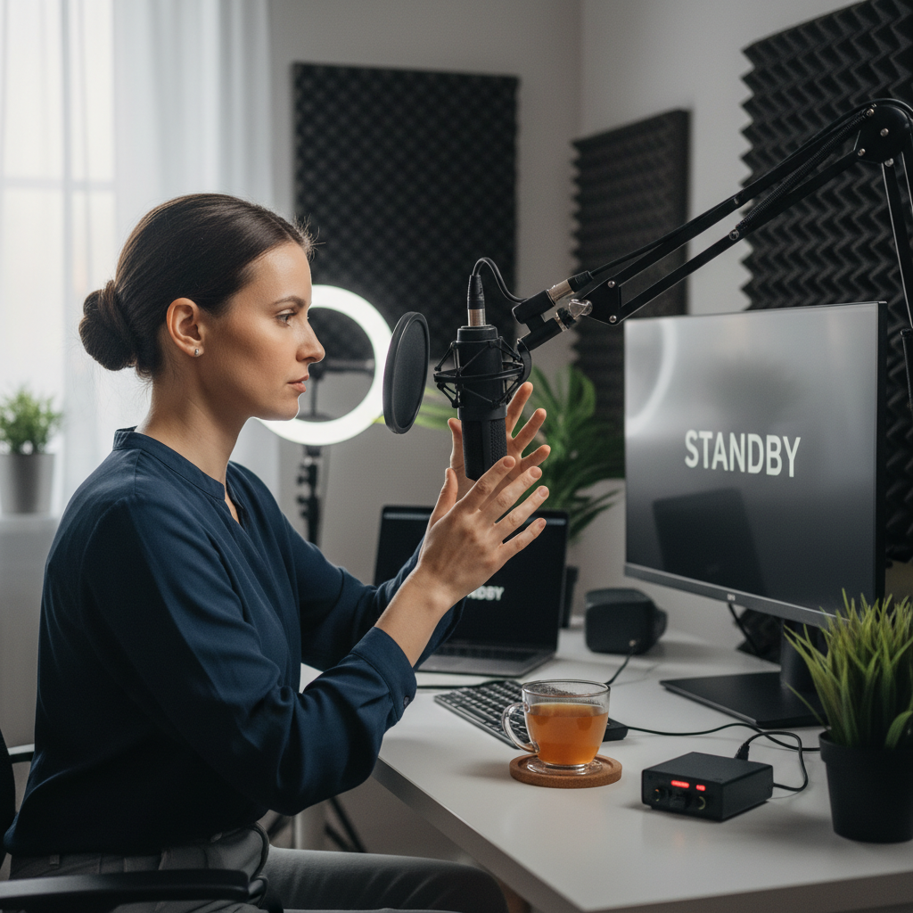 Prowadzący webinar przygotowuje mikrofon i otoczenie, by zapewnić najlepszą jakość nagrania do transkrypcji AI.