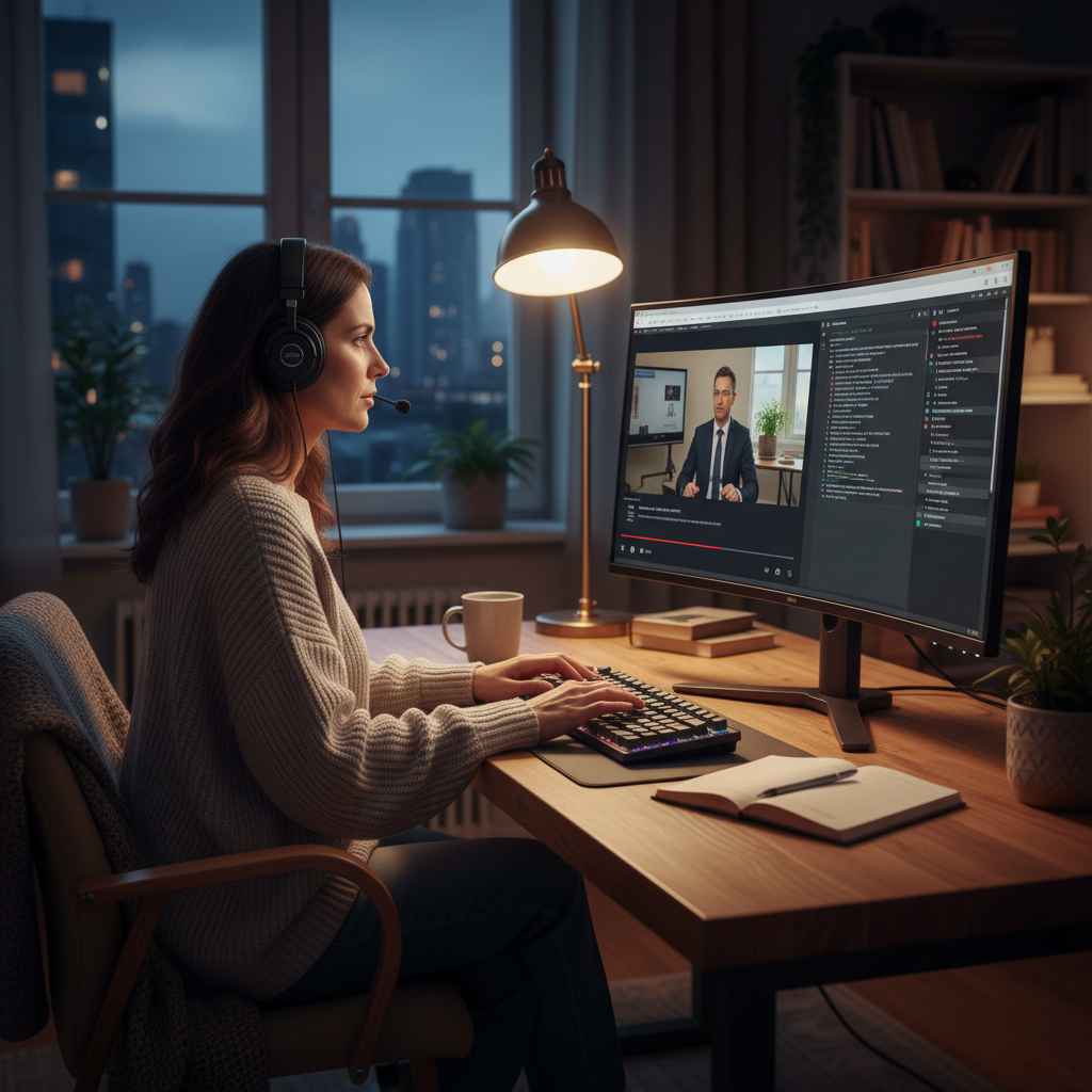 Specjalista przepisujący webinar za pomocą narzędzia do transkrypcji AI – szybka i skuteczna praca z nagraniami webinarów.