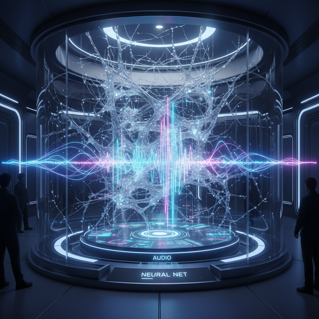 Ilustracja: sieć neuronowa „słuchająca” i interpretująca sygnał mowy.