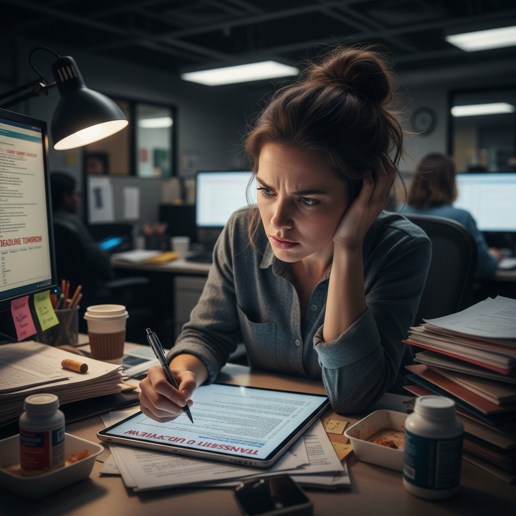 Fotografia: pracownik biura mierzący się z błędną automatyczną transkrypcją.