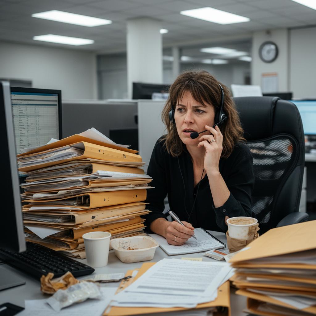 Stresująca scena biurowa – pracownik pochylony nad stosem papierów i dyktafonem, motyw przewodni: transkrypcja dyktowanych dokumentów.