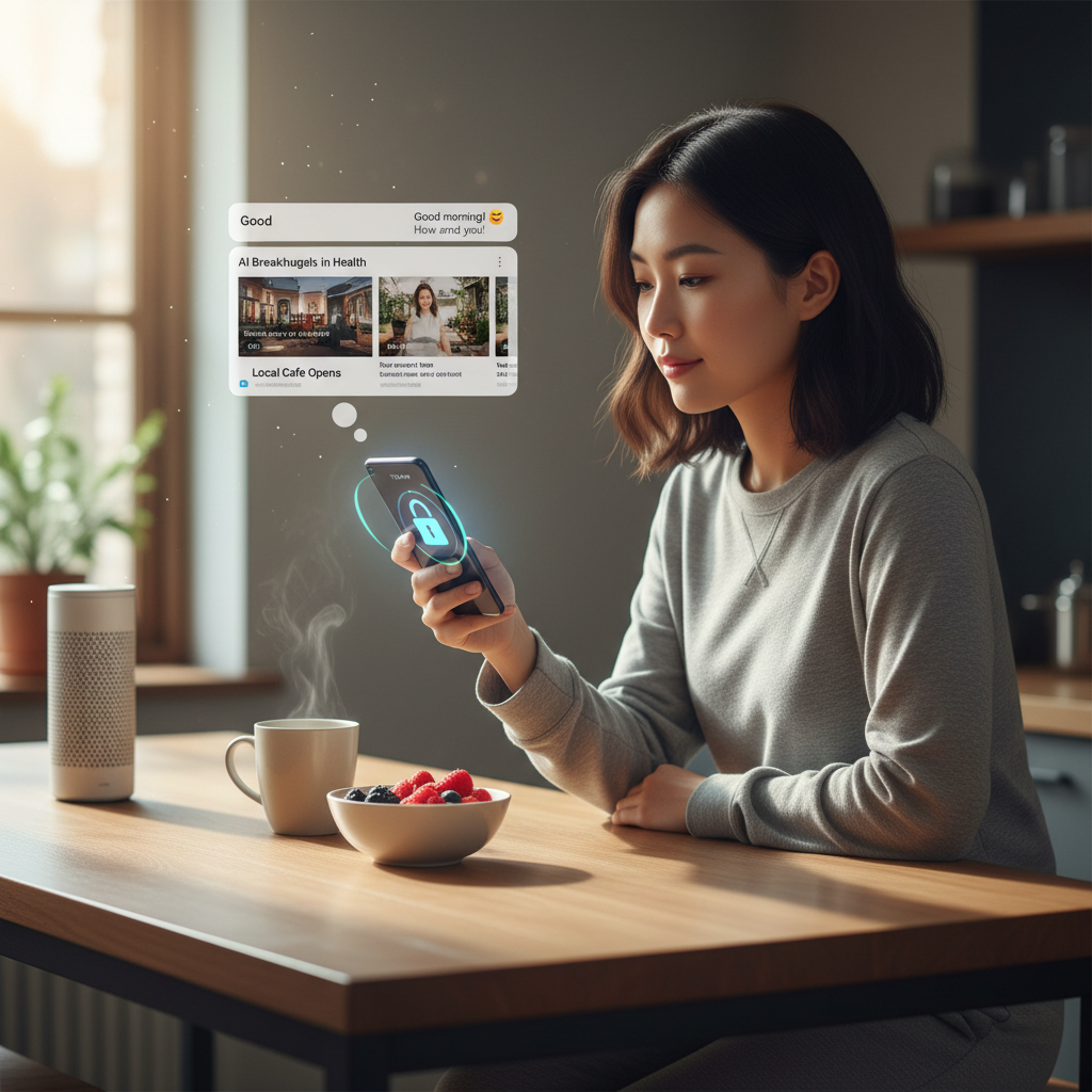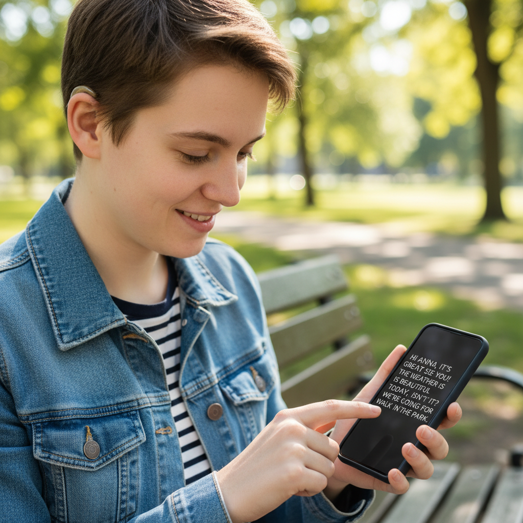 Zdjęcie: Osoba niesłysząca odczytuje transkrypt rozmowy na smartfonie, kluczowe słowa: transkrypcja, dostępność, równość